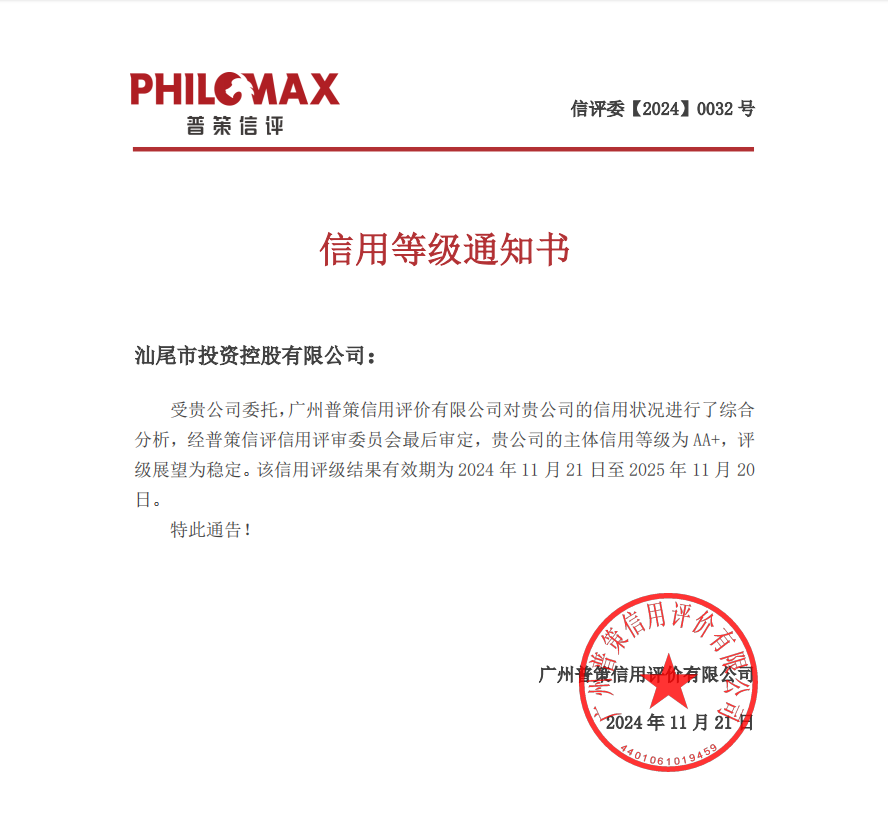 近日,經(jīng)廣州普策信用評價(jià)有限公司采用城市產(chǎn)業(yè)開發(fā)運(yùn)營企業(yè)評級模型綜合評定,汕尾市投資控股有限公司獲得主體信用AA+評級,評級展望為穩(wěn)定,成為汕尾市首家獲得AA+信用評級的國有企業(yè)。 AA+主體信用評級是資本市場信用評級的重要分水嶺,也是國內(nèi)投資級和投機(jī)級的重要劃分標(biāo)準(zhǔn)。此次獲得AA+主體信用評級,既是資本市場對汕尾投控在市場競爭力、運(yùn)營能力和可持續(xù)發(fā)展能力等方面的認(rèn)可和肯定,也有利于提振汕尾資本市場形象,提升公司市場競爭力和影響力,為加快實(shí)現(xiàn)公司高質(zhì)量發(fā)展提供更大規(guī)模、更多渠道、更低成本的資金支持。 展望未來,公司將進(jìn)一步聚焦市委市政府重點(diǎn)工作部署和“4+X”主業(yè)主責(zé)、“5+1+N”業(yè)務(wù)板塊,充分發(fā)揮AA+主體信用評級優(yōu)勢,牢牢把握市場機(jī)遇,不斷拓展融資渠道、降低融資成本、壯大資產(chǎn)規(guī)模,持續(xù)增強(qiáng)核心功能、提升核心競爭力,全力打造“值得信賴的現(xiàn)代國企集團(tuán)”,為推動汕尾經(jīng)濟(jì)社會高質(zhì)量發(fā)展貢獻(xiàn)更大力量。