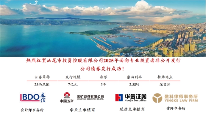 2025年4月18日,汕尾市投資控股有限公司(以下簡稱“投控公司”)在深圳證券交易所成功發(fā)行7億元公司債券,發(fā)行期限5年期,票面利率2.58%,本期債券募集資金用于置換存量公司債券,在保障公司債務安全的同時,持續(xù)降低公司融資成本。 近年來,公司累計在交易所市場發(fā)行各類債券合計24億元。通過發(fā)行公司債券,在大大降低公司融資成本、拉長債務周期和優(yōu)化債務結構的同時,有力保障公司剛性債務的償付,公司投融資能力持續(xù)提升。未來,投控公司將緊緊圍繞省委“1310”具體部署和市委“1+2+9”工作安排,深入聚焦公司戰(zhàn)略目標,持續(xù)優(yōu)化融資結構、拓寬融資渠道、強化融資能力、降低融資成本,奮力提升企業(yè)經(jīng)營效益,為汕尾經(jīng)濟社會高質量發(fā)展貢獻更多投控力量。